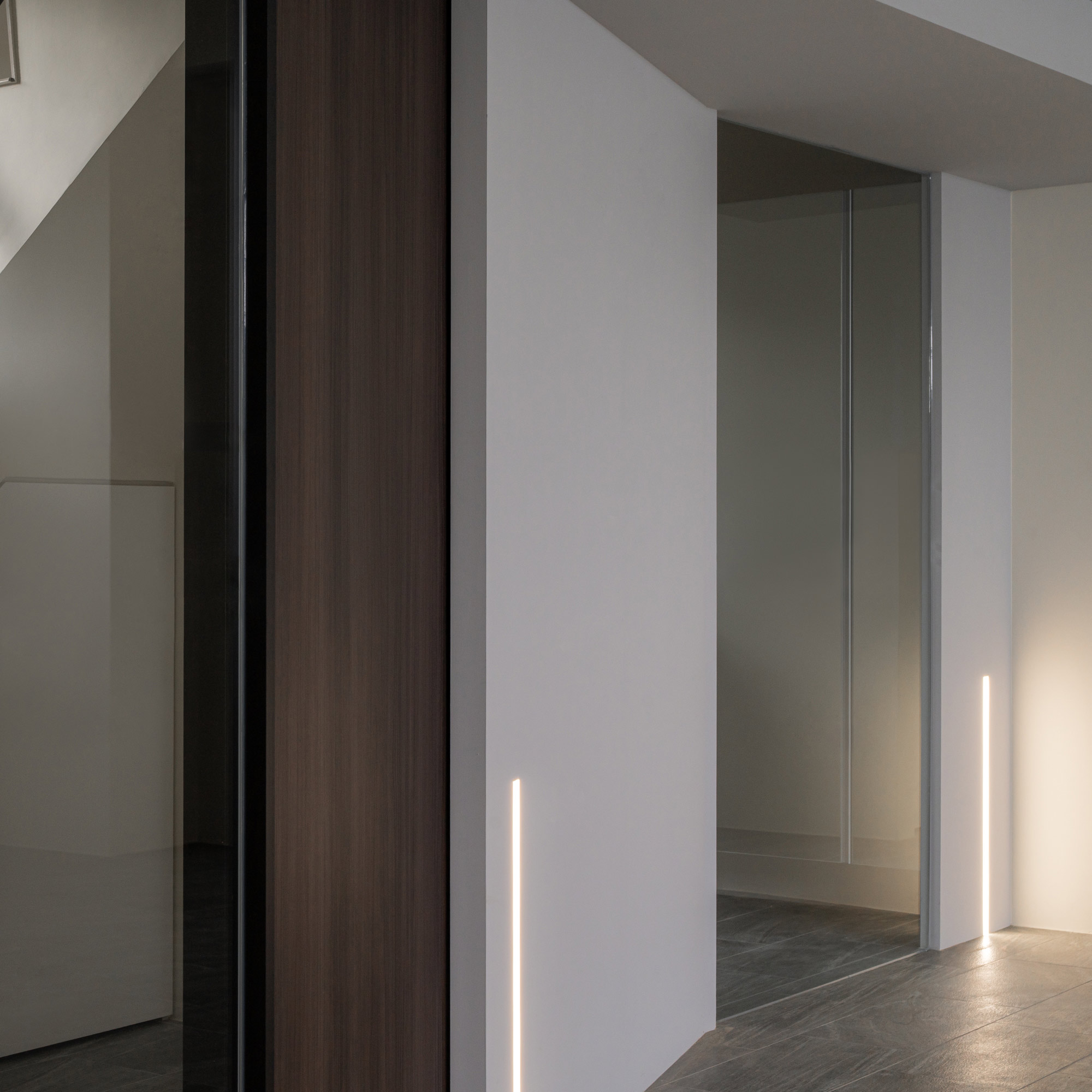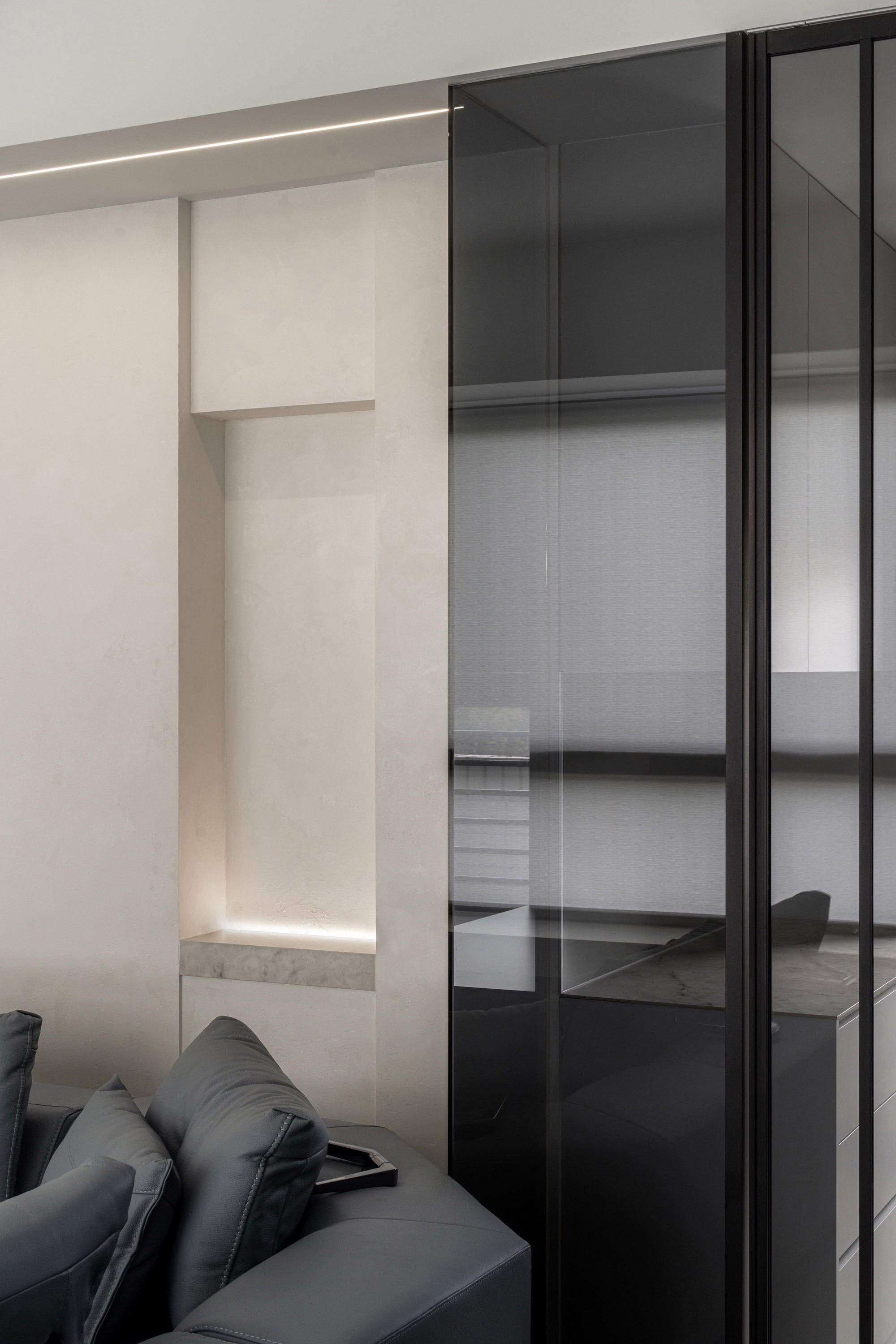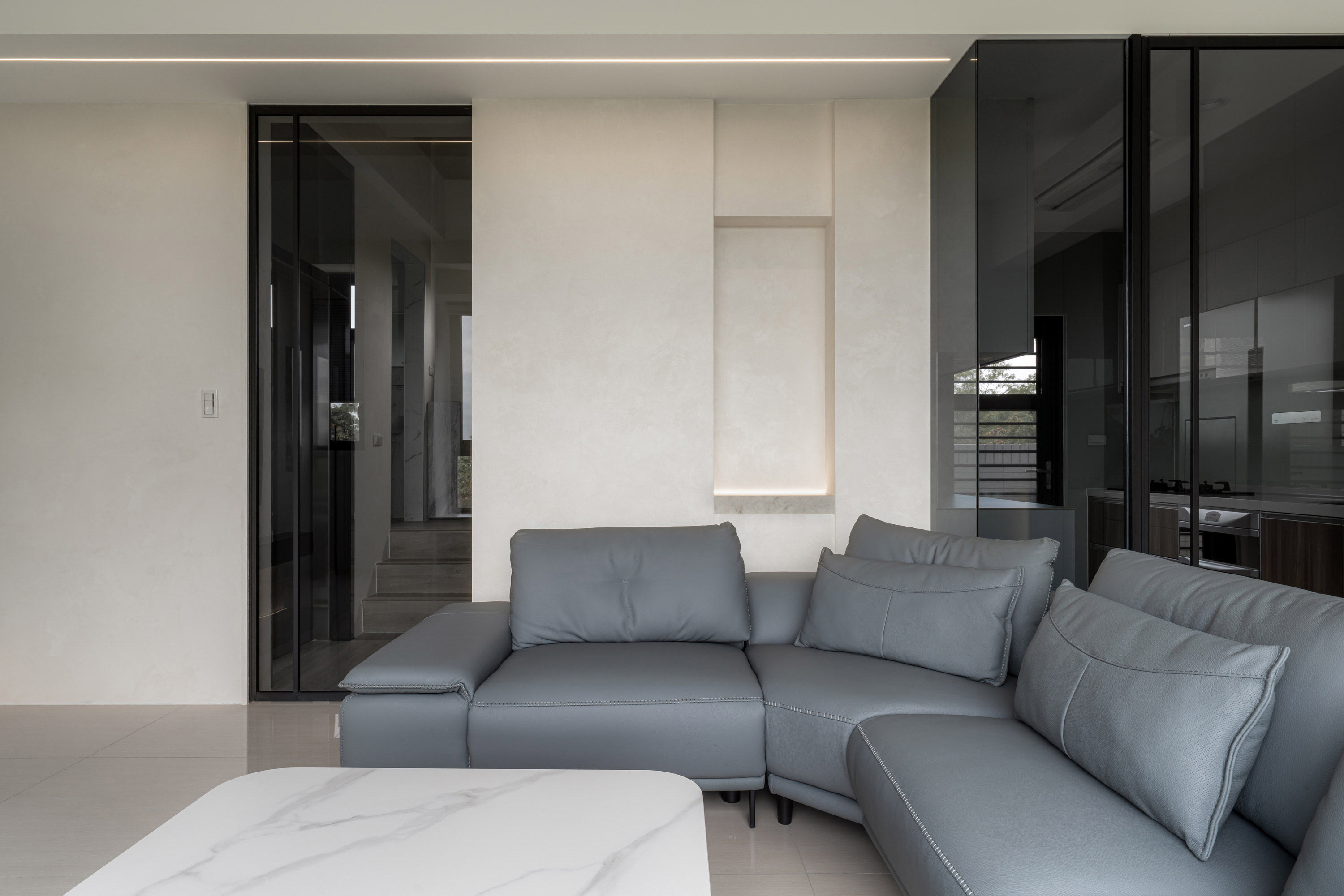 室內以低彩度、高質感的材質鋪陳,搭配簡潔俐落的線條語彙,營造沉穩且具包覆感的生活場域,形塑一處如隱士山居般的心靈居所。